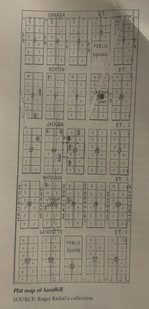 This was, and is yet, only a small village, but in an early time was considered quite an important trading point. However, the first term of the county court ever held, was called at Sand Hill, and several terms thereafter were held at that place.”